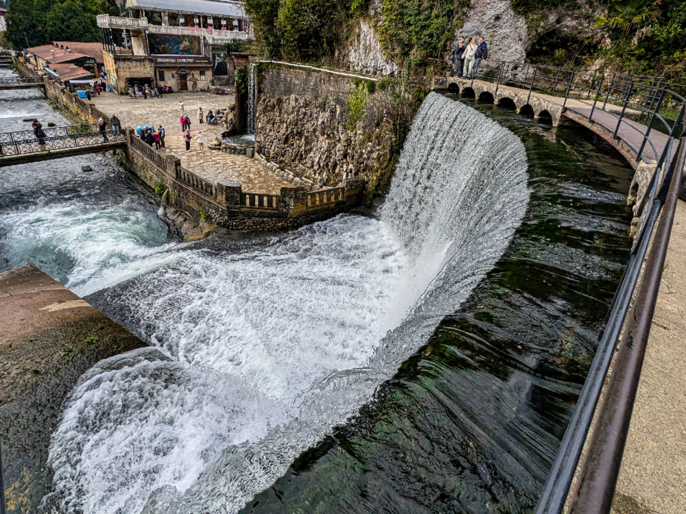 Водопад. В пойме р. Псырцха вода, застаиваясь, образовывала болота, порождавшие малярию и другие болезни. Для осушения этих болот и создания на их месте прудов иноки в 1882 г. соорудили плотину со шлюзами и двумя водопадами (высота нижнего – 8,6 м; длина по гребню – 21 м). Под этим водопадом были устроены обширные помещения, которые использовались как подвалы и холодильники. У плотины монахи построили 2-х этажную каменную мельницу, рядом пекарню. Вода по специальным каналам поступала также в лесопильню, прачечную, на кирпичный завод, орошала сады.