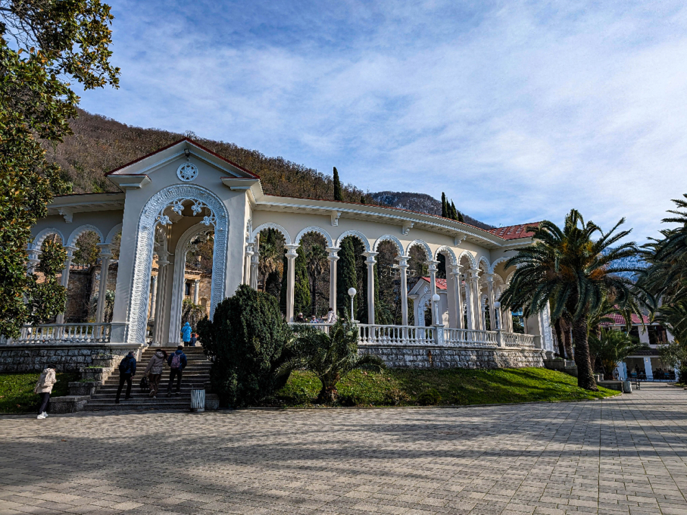 Колоннада находится в центре Старой Гагры. Живописная аркада в мавританском стиле, полукругом ограничивающая площадку с фонтаном